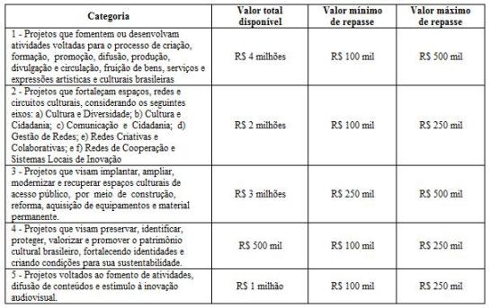 Os recursos serão divididos em cinco categorias, sendo que para os projetos ligados ao patrimônio cultural brasileiro, a previsão do edital é de investimento de R$ 500 mil. As ações devem ser de preservação, identificação, proteção, valorização e promoção do patrimônio cultural brasileiro, fortalecendo identidades e criando condições para sua sustentabilidade.