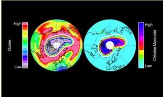 Os responsáveis pela destruição da camada de ozônio sobre as regiões polares são gases como os clorofluorocarbonetos (CFC), utilizados por meio século como componentes de refrigeração para máquinas de aerossóis, sendo seu uso proibido desde o Protocolo de Montreal.