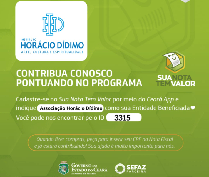 Agora o Instituto Horácio Dídimo integra o Programa Sua Nota tem Valor e pede o apoio. Para ser apoiador do IHD, basta fazer seu cadastro e escolher a instituição 3315 (Clique neste link).