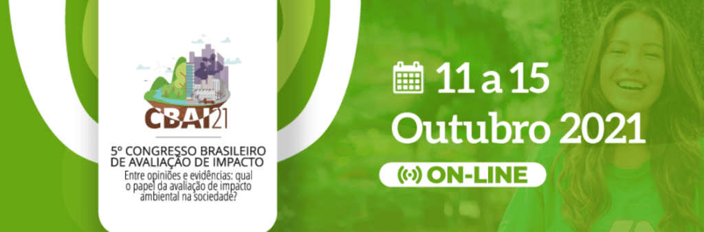 Em sua 5ª edição, o Congresso Brasileiro de Avaliação de Impacto deve ocorrer no período de 11 a 15 de outubro de 2021, de maneira virtual. Reconhecidamente o maior evento na área de Avaliação de Impacto e de Licenciamento Ambiental, este ano o tema do CBAI21 é “Entre opiniões e evidências: qual o papel da avaliação de impacto ambiental na sociedade?”.