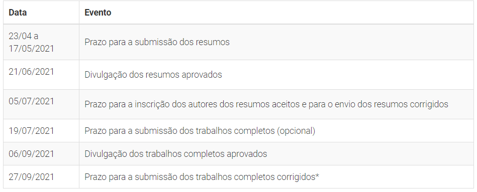 A submissão de trabalhos segue até o dia 17 de maio, procedimento todo on line, pelo site do evento (clique aqui). As datas estão no quadro a seguir.
