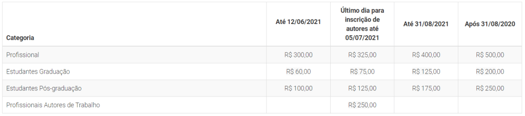 O público alvo do evento engloba profissionais da área de meio ambiente, consultores, representantes de órgãos ambientais, legisladores, acadêmicos, sociedade civil além de alunos de graduação e pós-graduação. O quadro, a seguir, traz os valores para participação do CBAI2021, existindo a possibilidade de desconto para grupo de 10 participantes (10%) e acima de 20 participantes (15%), com exceção de grupos de estudantes, considerando ser esta categoria com valor já diferenciado.
