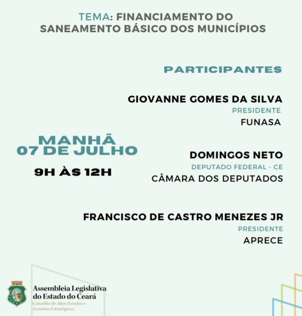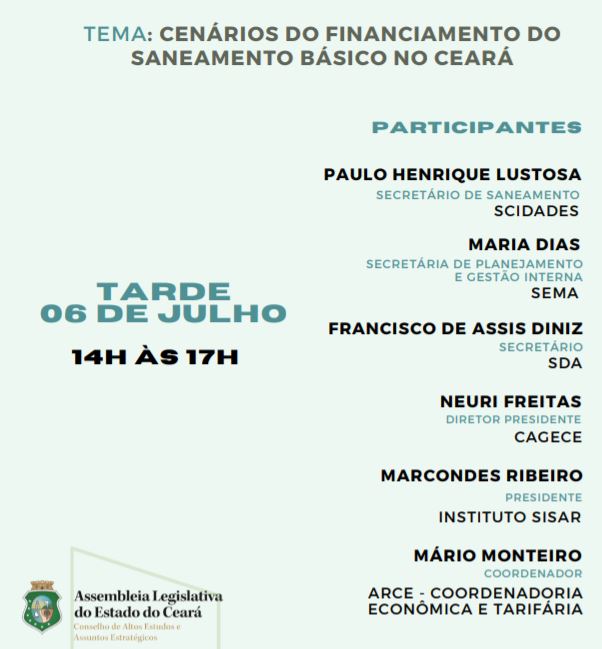 Assim, na direção de ampliar o debate da questão da universalização e sobretudo do financiamento para sua viabilização, o Conselho de Altos Estudos da Assembleia Legislativa do Estado do Ceará, que coordena o Pacto pelo Saneamento Básico, está com uma programação imperdível nos dias 6 e 7 de julho de 2021 com o Seminário Temático sobre financiamento para universalizar o Saneamento Básico.