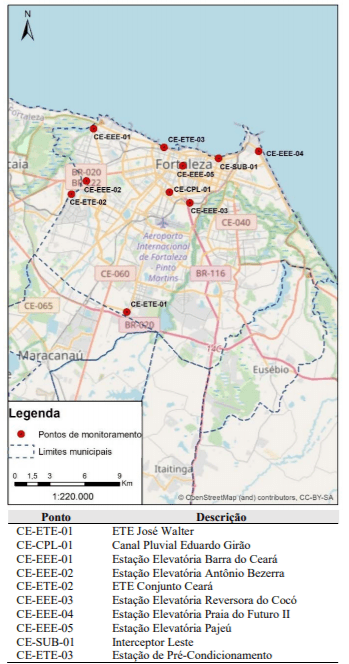 A Figura a seguir traz os pontos de monitoramento realizados no município de Fortaleza. Importante mencionar que o ponto de monitoramento ETE São Cristóvão (já divulgado inclusive no Blog Verde) foi substituído pelo Canal Pluvial Eduardo Girão (CE-CPL-01).