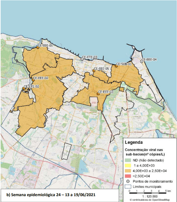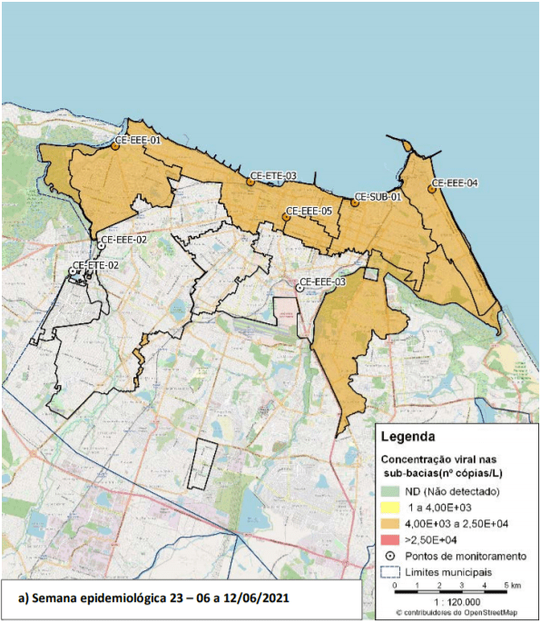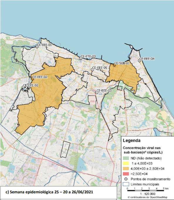 Segundo o Prof. Dr. André Bezerra, foram observadas concentrações intermediárias do SARS-CoV-2 em todos os pontos monitorados em Fortaleza nas semanas epidemiológicas analisadas, no mês de junho de 2021. Destaca-se a relevância do trabalho de monitoramento empreendido pela equipe coordenada pelo Prof. André Bezerra, da UFC, no sentido de auxiliar o direcionamento das políticas públicas de promoção à saúde.