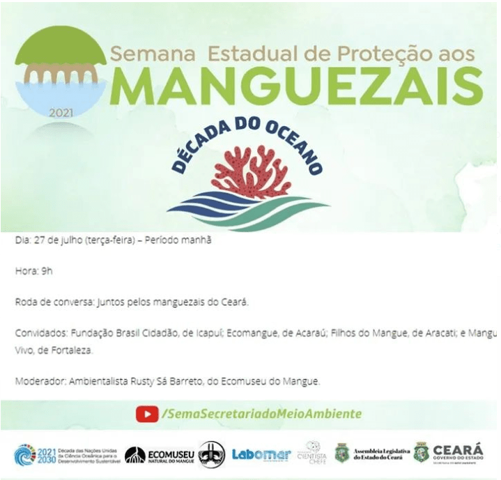 No dia 27 de julho, às 09:00h, o IFCE Campus Acaraú e o PGTGA/IFCE, por meio da profa. Rafaela Maia, estarão presentes na Roda de Conversa intitulada “Juntos pelos Manguezais do Ceará” com o pessoal da Fundação Brasil Cidadão de Icapuí; Filhos do Mangue de Aracati e Mangue Vivo, de Fortaleza. O moderador desse momento será o ambientalista Rusty Sá Barreto, do Ecomuseu do Mangue. Aos interessados, cliquem aqui.