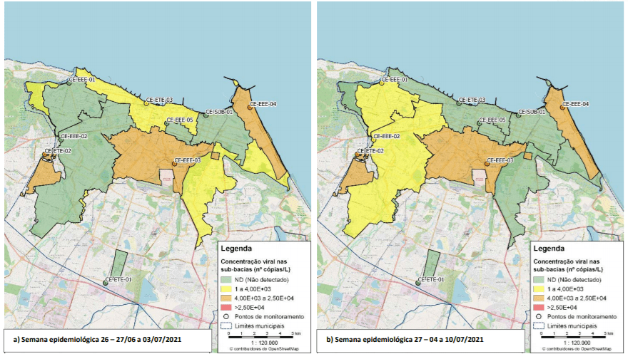 Segundo o Prof. Dr. André Bezerra, no mês de julho de 2021, foi observada tendência de diminuição das cargas de SARS-CoV-2 ao longo das últimas semanas epidemiológicas. Na semana epidemiológica 27, o SARS-CoV-2 não foi detectado na Estação de Pré-condicionamento (CE-ETE-03), estação que recebe contribuição de esgoto de cerca de 61% da população de Fortaleza, sendo que nas semanas 28 e 29, as concentrações virais foram baixas neste ponto.