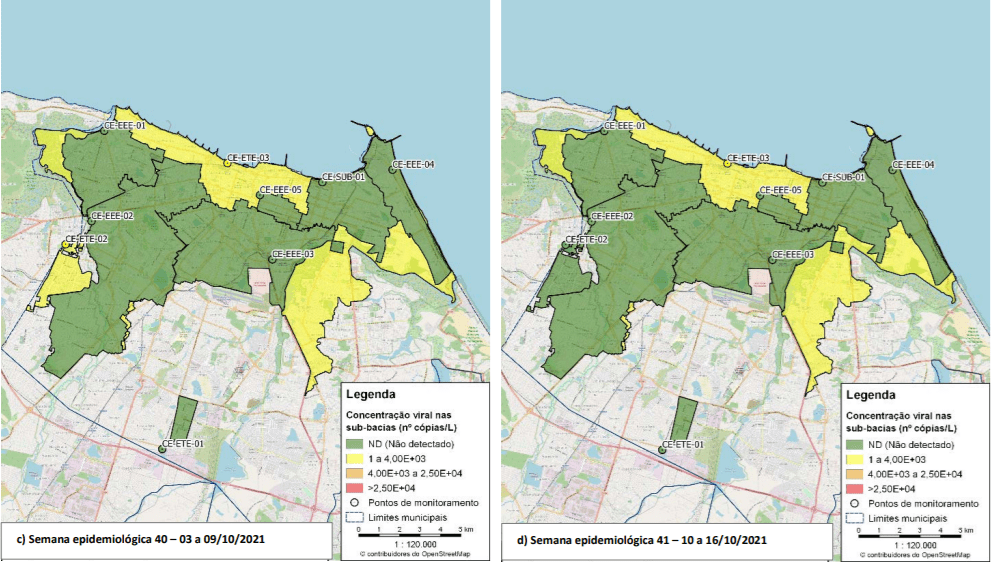 Conforme o coordenador do monitoramento na cidade de Fortaleza, Prof. Dr. André Bezerra, da UFC, na semana epidemiológica 41 (15/10/2021) o SARS-CoV-2 foi detectado apenas na Estação de Pré-condicionamento (CE-ETE-03).