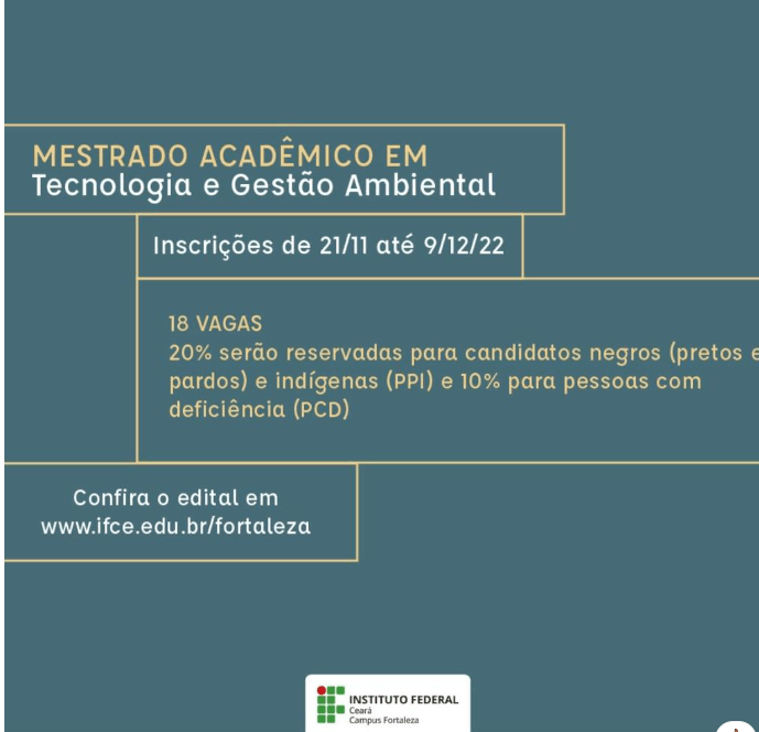 O Instituto Federal do Ceará, campus Fortaleza, está com edital público aberto a ofertar 18 vagas no Mestrado Acadêmico em Tecnologia e Gestão Ambiental, na área de concentração em Gestão e Saneamento Ambiental, vinculado ao Programa de Pós-Graduação em Tecnologia e Gestão Ambiental.