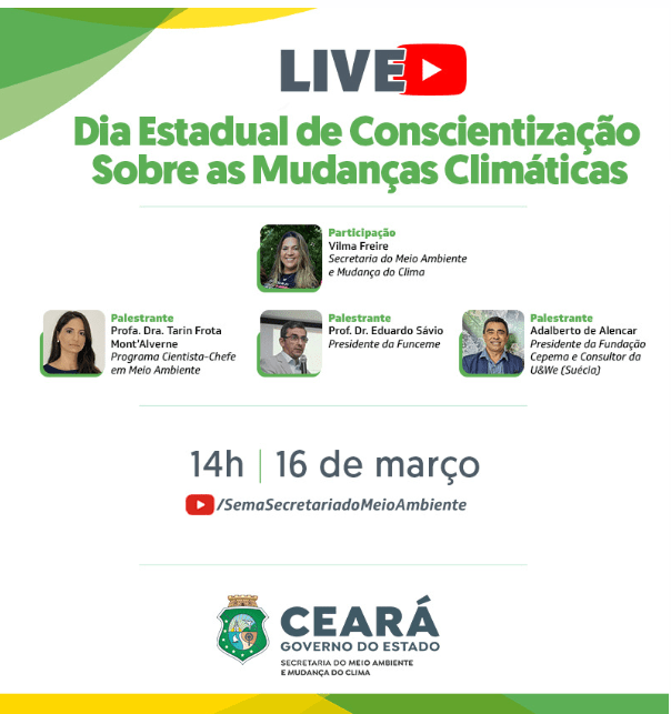 A Secretaria de Meio Ambiente e Mudança do Clima do Ceará, no dia 16 de março, às 14h, fará uma live no Dia Estadual de Conscientização sobre as Mudanças Climáticas, com o Seminário Virtual “O Panorama das Mudanças Climáticas no Ceará”, tendo a participação da Secretária Vilma Freire e com os palestrantes Prof. Eduardo Sávio, Sr. Adalbeto de Alencar e Profa. Tarin Mont’Alverne. A live acontece no canal da SEMA no You Tube (cliquem aqui para acessar).