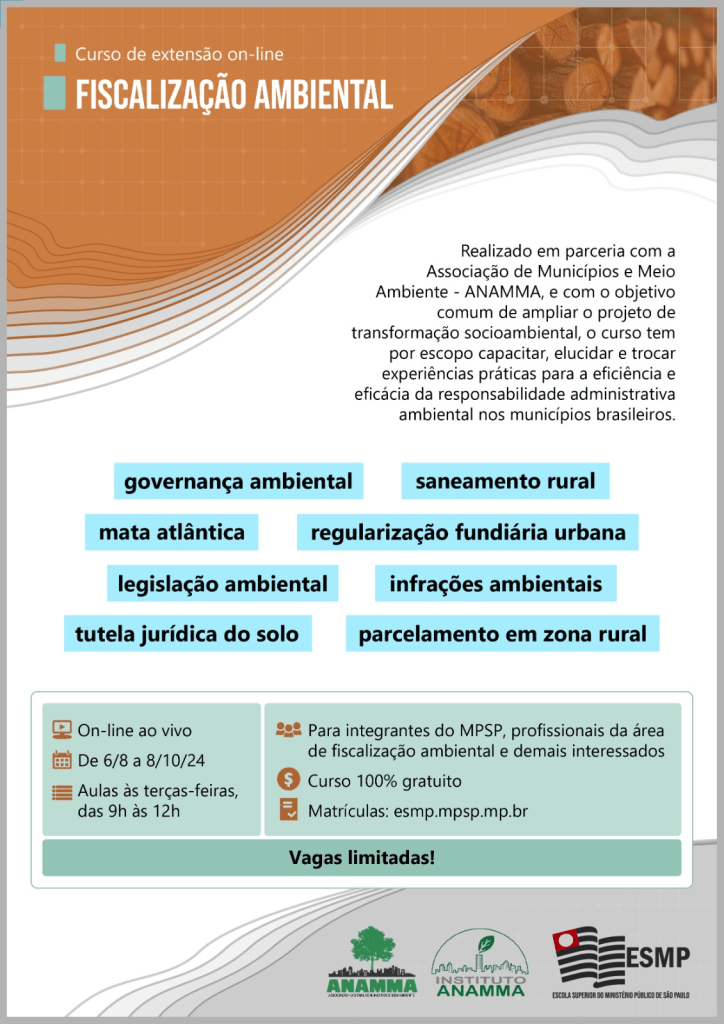 A Escola Superior do Ministério Público de São Paulo em parceria com a Associação de Municípios e Meio Ambiente – ANAMMA está com inscrições abertas para curso de extensão gratuito, que tem por objetivo a capacitação de membros e servidores do MPSP, corpo técnico dos municípios (administração direta e indireta), consórcios públicos, fiscais urbanos e ambientais, guardas municipais e demais interessados para atuar em suas áreas de atribuição constitucional, incluindo a defesa do meio ambiente saudável e equilibrado acessível para todos.